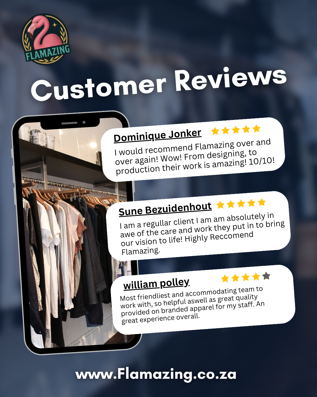 Flamazing was born when Bianca Dodd—a seasoned branding and promotional merchandise printing powerhouse—teamed up with Reuben Le Roux, a social-media native and agency owner obsessed with growth. We combined Bianca’s production precision (colour accuracy, fabric know-how, print quality) with Reuben’s strategy, content, and analytics to build a single partner that takes brands from idea → identity → content → merch.